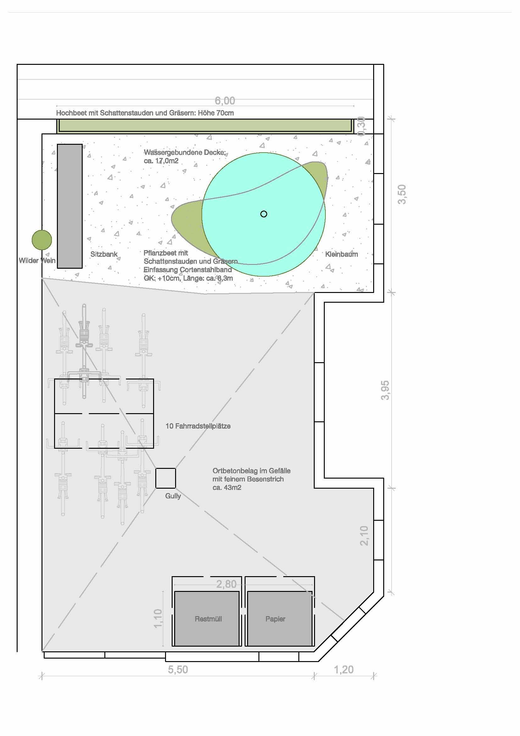 Zuerst wird Platz geschafft: die Müllbehallter werden neu organisiert und aufgestellt, die Fahrradständer platzsparend positioniert. Der Bodenbelag wird erneuert: Ortbetonfelder mit Besenstrich; die Sitzbereiche bekommen eine wassergebundene Decke. Die Wände werden verputzt und neu gestrichen. Ein schattenverträgliche Baum wirkt raumbildend und schafft Atmosphäre. Das geschwungene Pflanzbeet ist mit Schattenstauden und Gräsern, bepflanzt. An der Wand wachsen Kletterpflanzen.