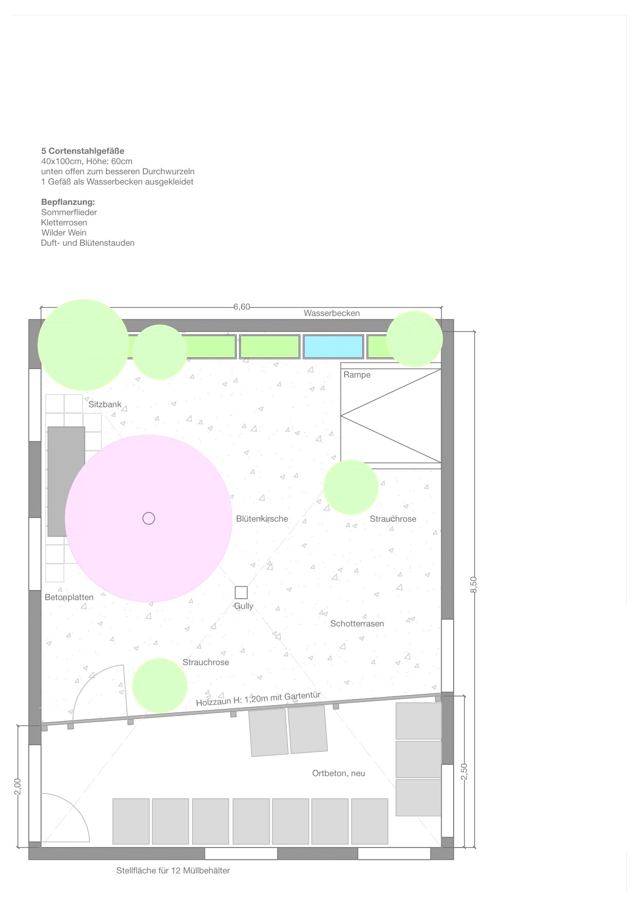 Der Beton wird aufgebrochen und statt dessen eine durchlässige, wassergebundene Decke angelegt. Eine Zierkirsche passt von den Proportionen ganz gut, vor der Mauer werden Pflanzgefäße aus Cortenstahl für Sommerflieder und Stauden aufgereiht. Die Müllgefäße werden durch einen halbhohen Holzzaun mit feiner Lattung versteckt. Der Belag wird in Ortbeton ausgeführt, was ein leichteres Hantieren mit den Müllkübeln ermöglicht.