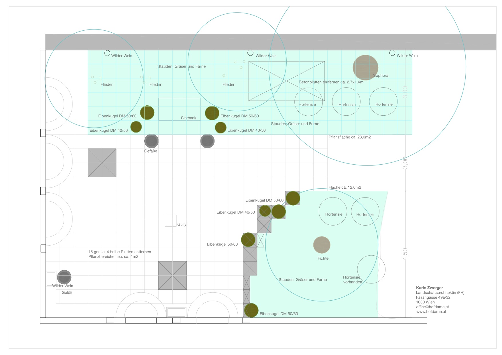 Unter den großen, alten Bäumen ist es sehr schattig. Die Eigentümerin wünscht sich eine Neugestaltung im englischen Stil.